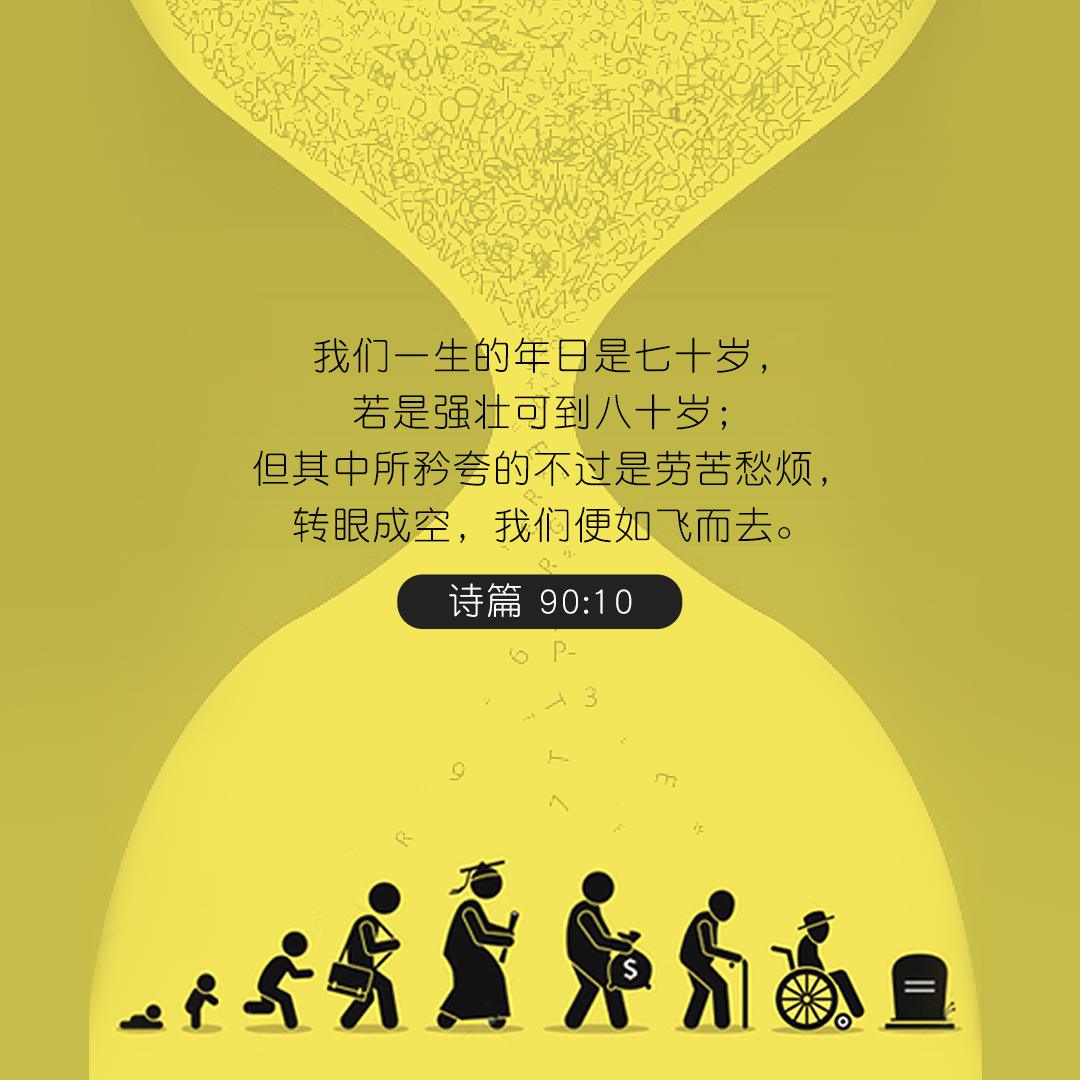 摩西对神说:“我们经过的日子都在你的震怒之下,我们度尽的年岁好像一声叹息。我们一生的年日是七十岁,若是强壮可到八十岁,但其中所矜夸的不过是劳苦愁烦,转眼成空,我们便如飞而去。”(诗篇90:9–10)