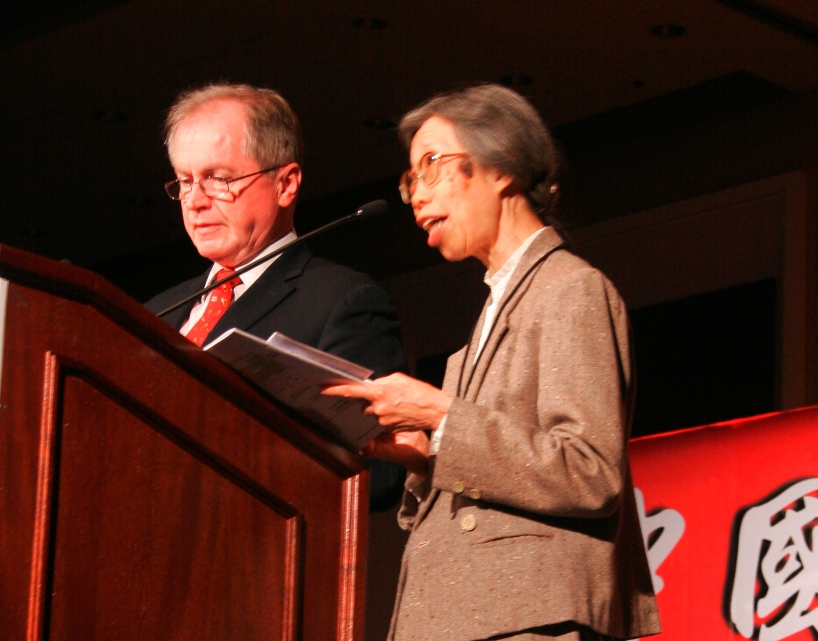 梁坤仪传道在福音大会上为卡森博士作翻译