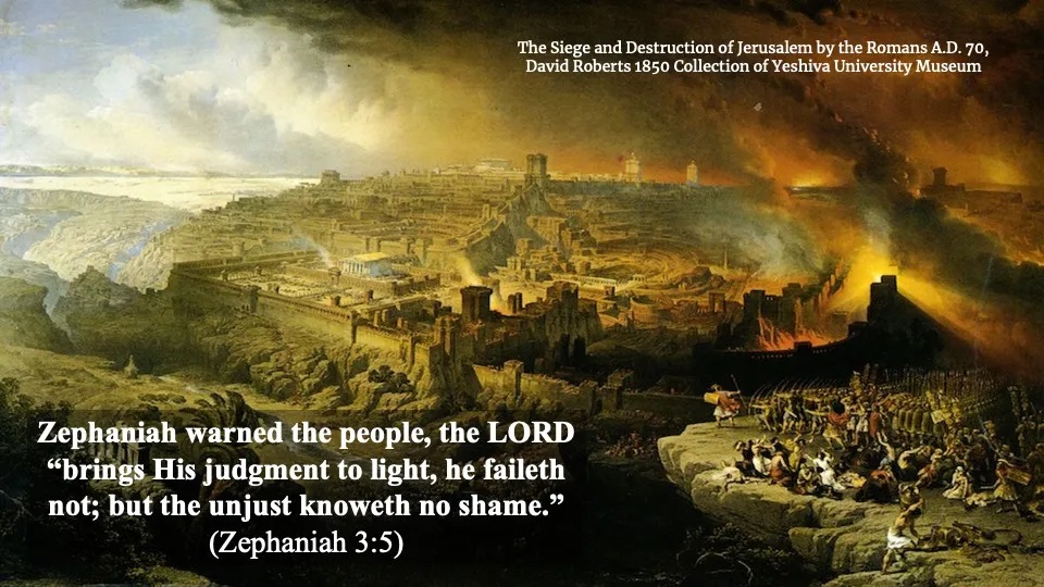 耶利米先知和西番雅先知是同时代的人(前面我们已经提过),耶利米做先知的日子比较久,犹大人被掳到巴比伦之后他仍然做先知,所以他看到圣城被毁的景况。他们这二位先知所讲的实际上都不是城的问题,不是物质的东西,而是城里面人的问题。所以悖逆的结果就是从繁荣到萧条,从尊大到低位,从高贵到卑下。悖逆的结果。