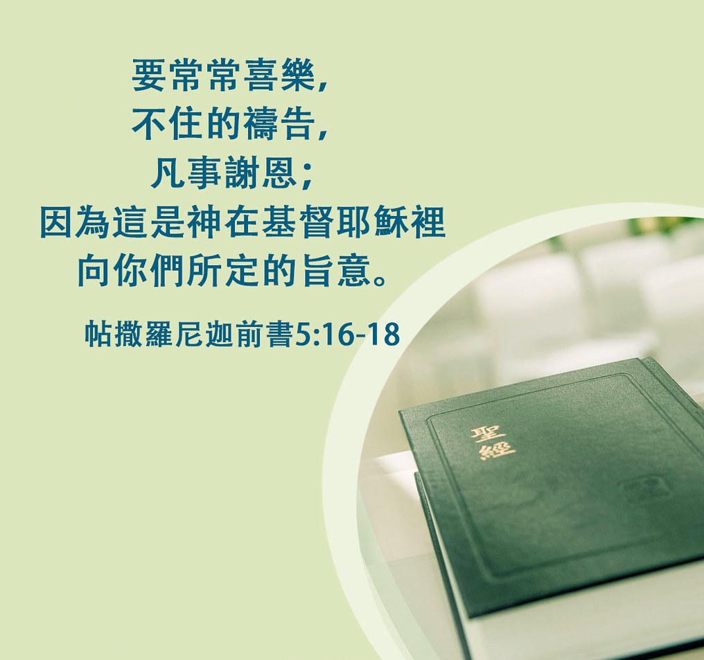 “要常常喜乐,不住地祷告,凡事谢恩。因为这是神在基督耶稣里向你们所定的旨意。”(帖前5:16–18)