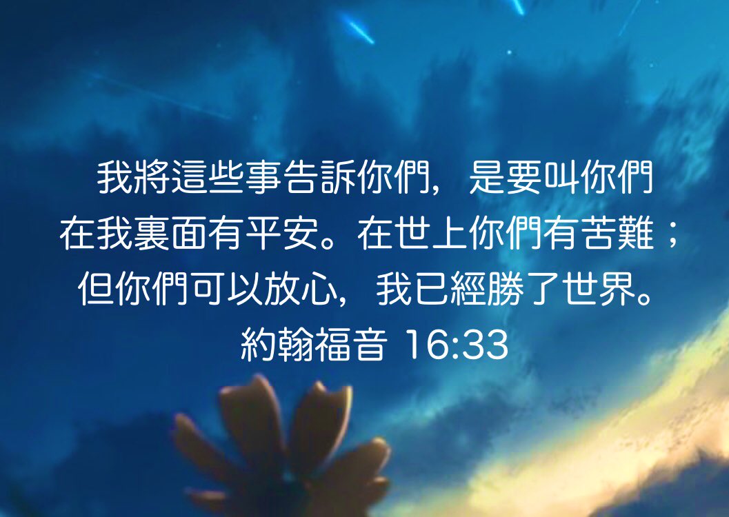 “我将这些事告诉你们,是要叫你们在我里面有平安。在世上你们有苦难。但你们可以放心,我已经胜了世界。”(约16:33)