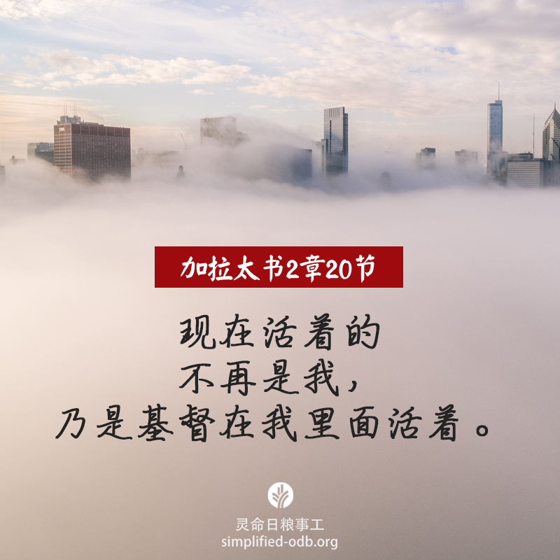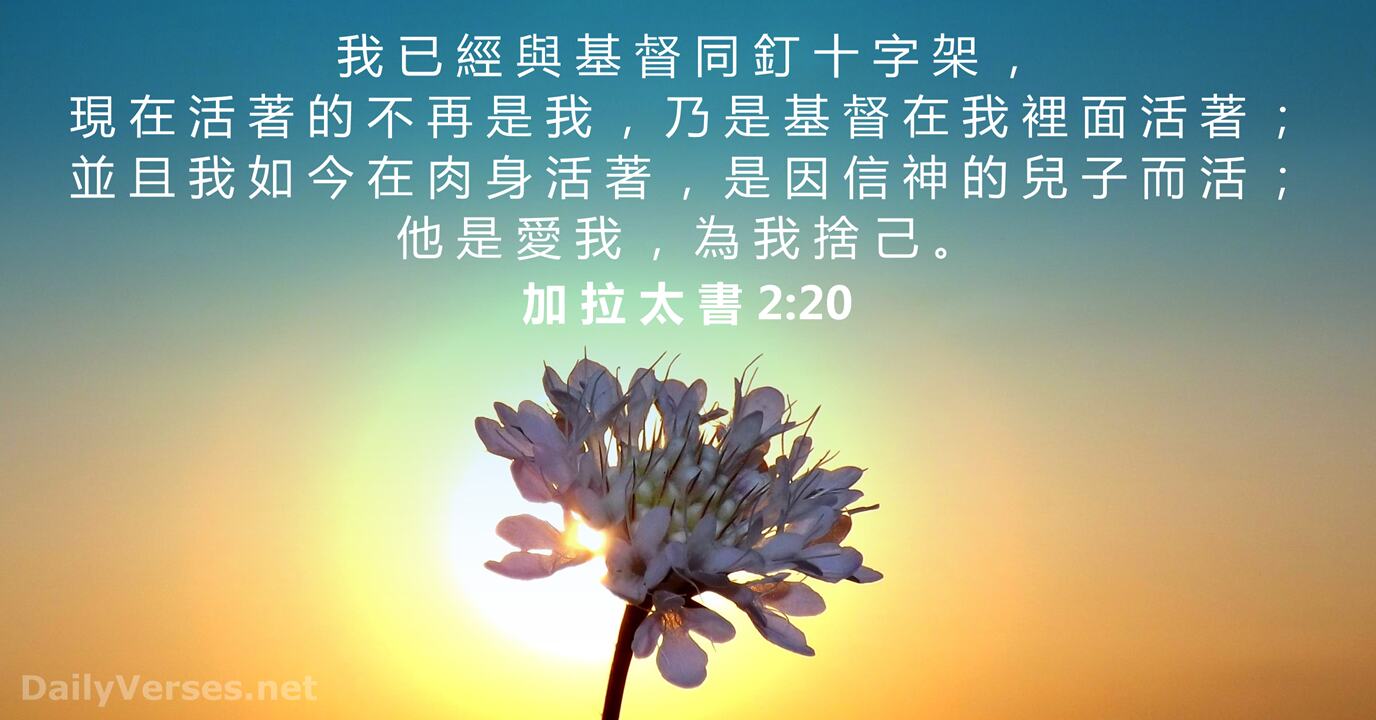 加拉太书 2:20,“我已经与基督同钉十字架。现在活着的,不再是我,乃是基督在我里面活着。并且我如今在肉身活着,是因信神的儿子而活,祂是爱我,为我舍己。”