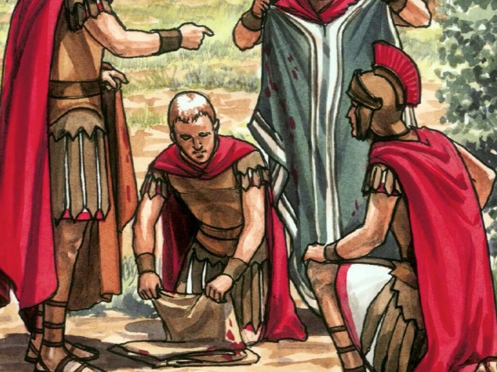 当主耶稣为赎世人所犯的罪恶、以最残酷的刑罚被钉在十字架上的时候,残忍、硬心、无知的罗马兵丁,在耶稣的十字架下玩赌博的游戏,加增主耶稣内心的苦痛,他们分了祂的外衣,为祂的里衣拈阄。然而,借着罪恶的罗马兵丁之手,耶稣诞生前一千年诗篇上的预言,就这样应验了。
