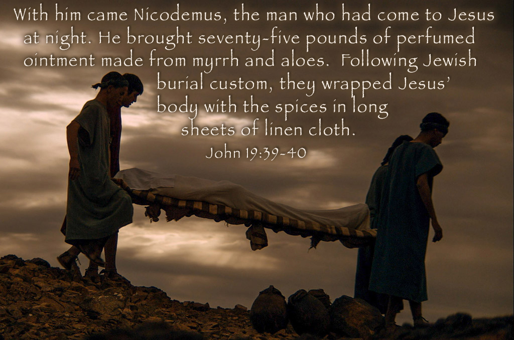 “又有尼哥底母,就是先前夜里去见耶稣的,带着没药,和沉香,约有一百斤前来。他们就照犹太人殡葬的规矩,把耶稣的身体,用细麻布加上香料裹好了。”(约19:39–40)