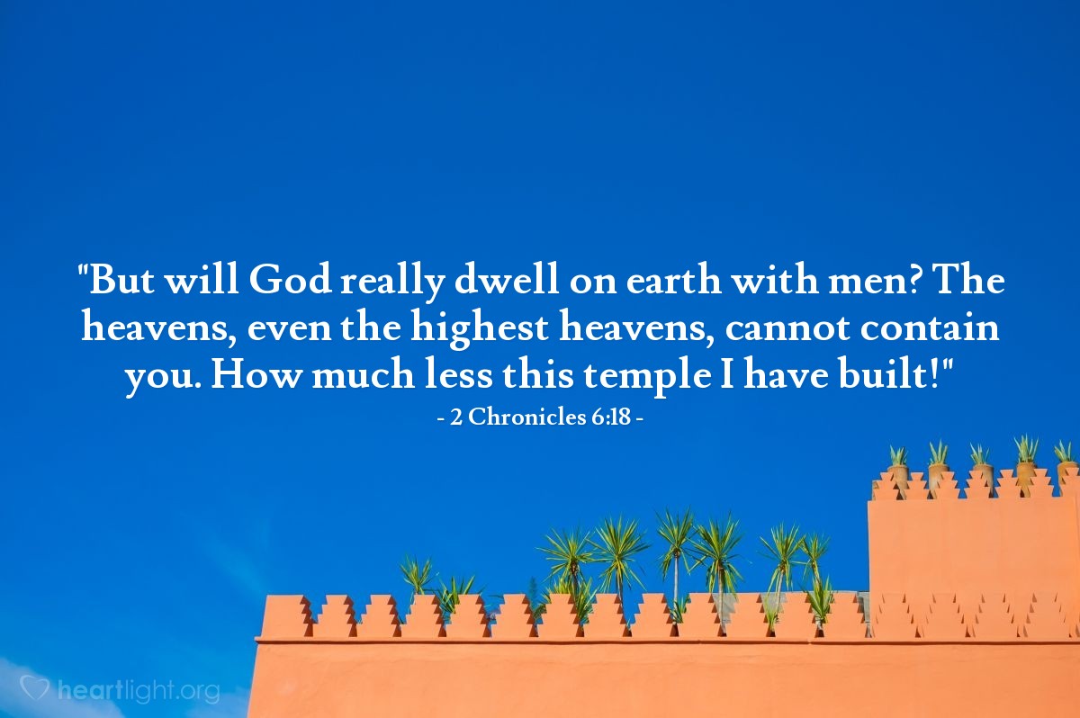 “神果真与世人同住在地上吗?看哪!天和天上的天,尚且不足你居住的,何况我所建的这殿呢?唯求耶和华我的神,垂顾仆人的祷告祈求,俯听仆人在你面前的祈祷呼吁。愿你昼夜看顾这殿,就是你应许立为你名的居所,求你垂听仆人向此处祷告的话。你仆人和你民以色列向此处祈祷的时候,求你从天上你的居所垂听,垂听而赦免。”(代下6:18–21)