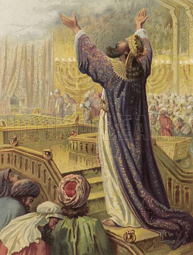 后来所罗门继承了大卫的遗志,为耶和华神在耶路撒冷建造圣殿。当圣殿落成,所罗门再次邀请了所有的领袖、长老以及以色列的百姓,来到耶路撒冷举行盛大的献殿典礼。祭司和利未人把约柜放进圣殿里,然后献祭,神的荣耀就充满在圣殿当中,祭司甚至站立不住。就在这时候,所罗门向所有的会众宣告神的应许成就,并且跪在祭坛面前开始祷告,这个祷告跟他之前求智慧的祷告不同,这个祷告不是为他个人,而是为以色列国家、为新建的圣殿,以及为众百姓甚至为外邦人的代求。
