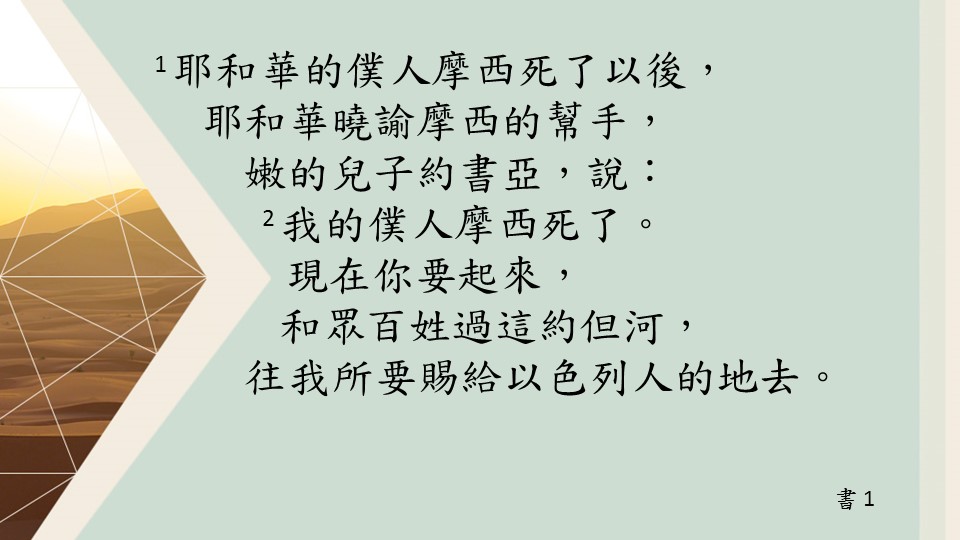 摩西死后,神对约书亚说,“我的仆人摩西死了,现在,你要起来,和众百姓过这约但河,往我所要赐给以色列人的地去……(你)只要刚强,大大壮胆,谨守遵行我仆人摩西所吩咐你的一切律法……总要昼夜思想,好使你谨守遵行这书上所写的一切话。如此你的道路就可以亨通,凡事顺利。”