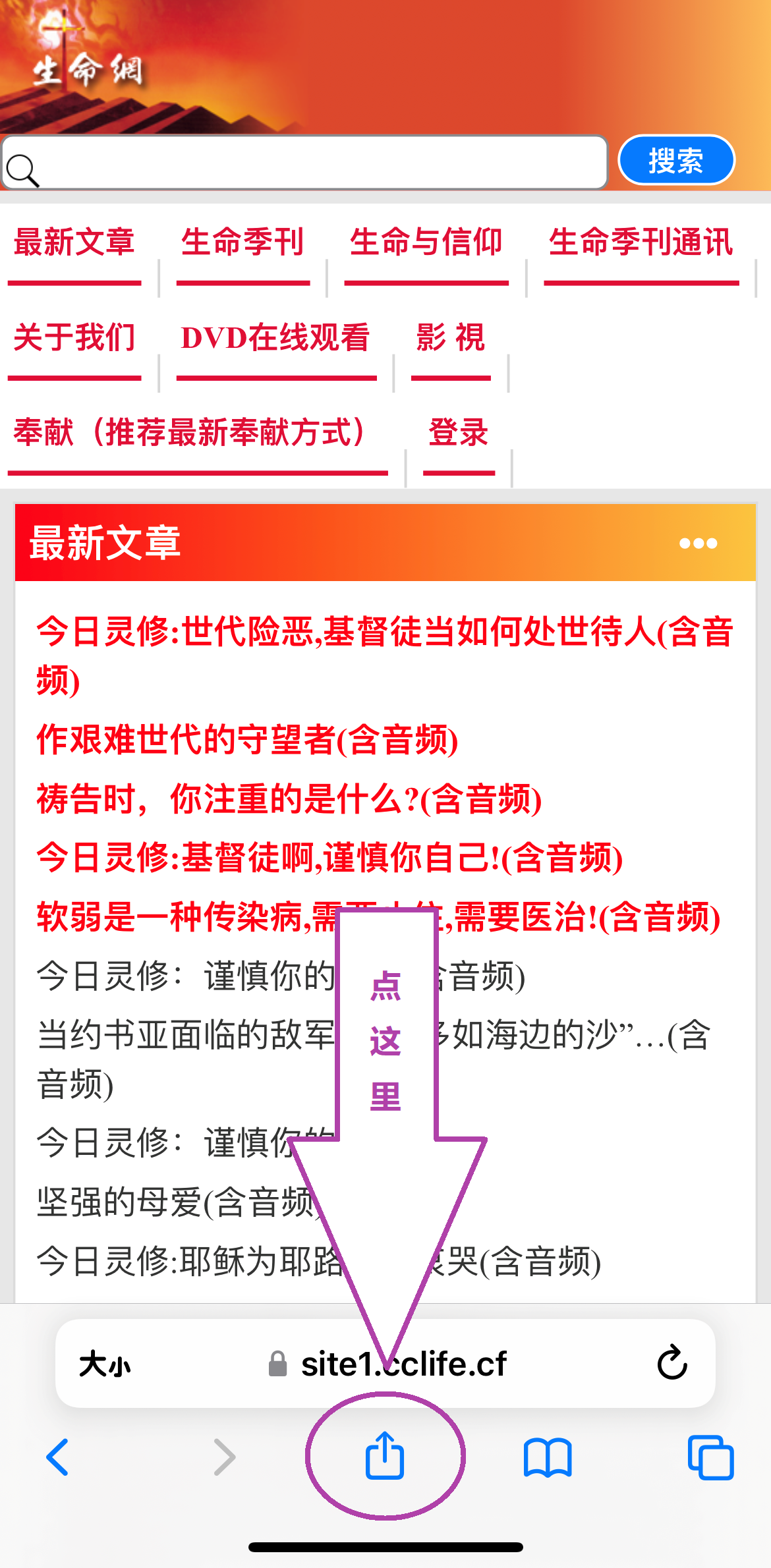 因为微信有时会封住某一篇季刊文章的链接,您可以绕过微信,直接把生命季刊的网页设置到自己的手机桌面,这样您就可以随时不受拦阻地阅读本刊属灵文章了。具体方法:
