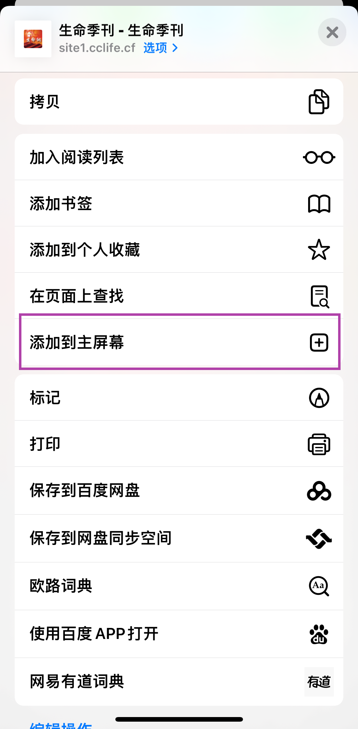 如果您是苹果用户,苹果手机自带的Safari浏览器,支持打开生命季刊的任意一个链接。苹果手机设置桌面图标如图示: