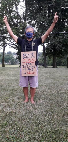 更奇妙的是,上帝感动鸿图身上挂着牌子,写着Repent for the kingdom of God is near(天国近了,你们应当悔改), Shine for Jesus(为耶稣发光)等属灵信息,两年来在Wilmore街道上行走并举手祷告,宣告悔改和复兴,成为家传户晓的事,感动不少人。没人知道什么时候有复兴,甚至有人疑惑这个罪恶时代还会有复兴吗?但无论如何,鸿图知道顺服上帝的呼召是当前要务。