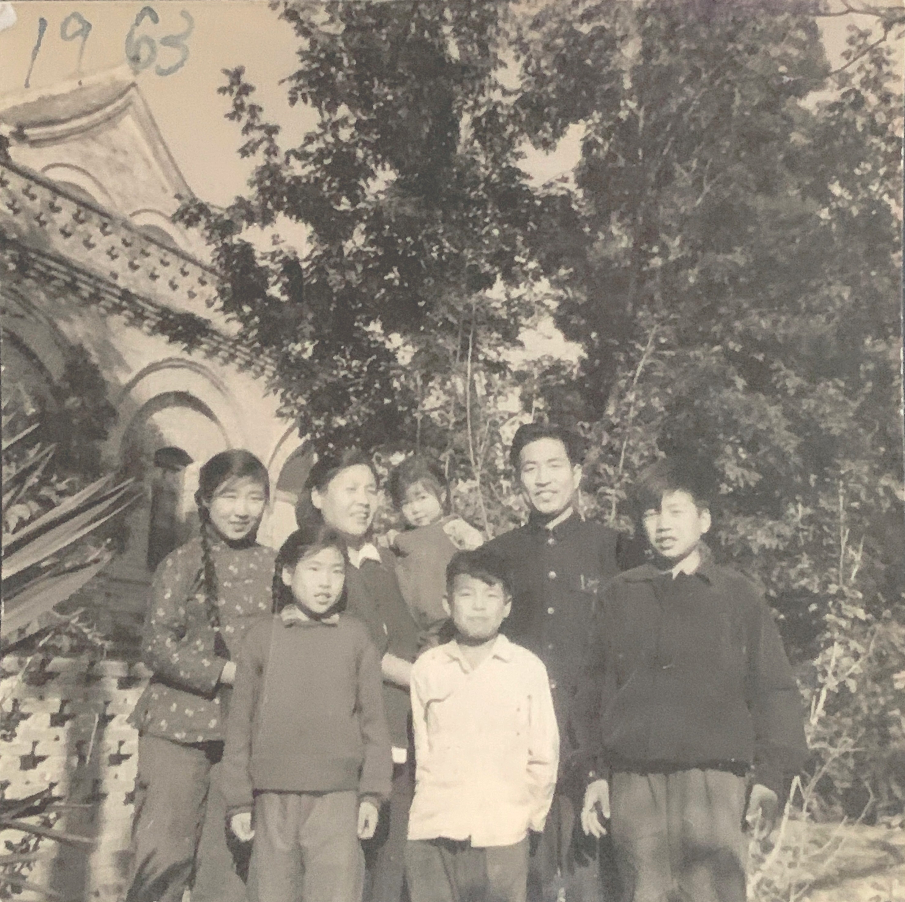 作者(前左1)全家摄于1963年,背景为宣教士楼及花园
