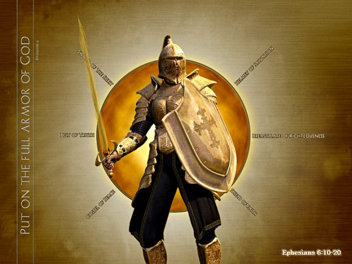 以弗所书第6章说:“我还有末了的话,你们要靠着主,倚赖祂的大能大力,作刚强的人。要穿戴神所赐的全副军装,就能抵挡魔鬼的诡计。因我们并不是与属血气的争战,乃是与那些执政的、掌权的,管辖这幽暗世界的,以及天空属灵气的恶魔争战。所以要拿起神所赐的全副军装,好在磨难的日子,抵挡仇敌,并且成就了一切,还能站立得住。所以要站稳了,用真理当作带子束腰,用公义当作护心镜遮胸。又用平安的福音,当作预备走路的鞋穿在脚上。此外又拿着信德当作藤牌,可以灭尽那恶者一切的火箭。并戴上救恩的头盔,拿着圣灵的宝剑,就是神的道。靠着圣灵(即“在圣灵里”),随时多方祷告祈求;并要在此儆醒不倦,为众圣徒祈求。”(弗6:10–18)