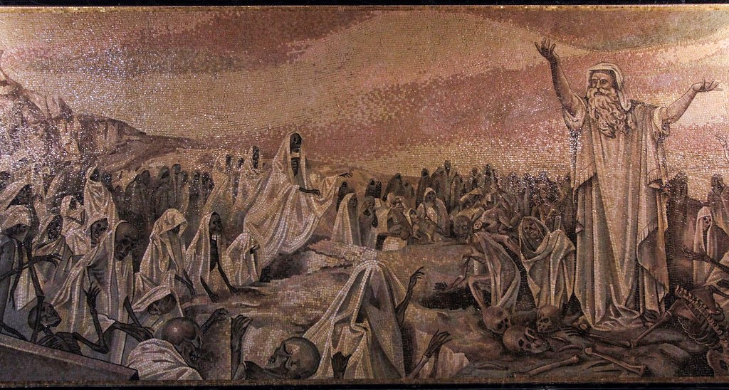 耶和华的灵降在我身上,耶和华借祂的灵带我出去,将我放在平原中。这平原遍满骸骨。祂使我从骸骨的四围经过。谁知在平原的骸骨甚多,而且极其枯干。祂对我说,“人子啊,这些骸骨能复活吗?”我说,“主耶和华啊,你是知道的。”祂又对我说,“你向这些骸骨发预言,说,‘枯干的骸骨啊,要听耶和华的话。’”主耶和华对这些骸骨如此说,“我必使气息进入你们里面,你们就要活了。我必给你们加上筋,使你们长肉,又将皮遮蔽你们,使气息进入你们里面,你们就要活了。你们便知道我是耶和华。”于是我遵命说预言。正说预言的时候,不料,有响声,有地震。骨与骨互相联络。我观看,见骸骨上有筋,也长了肉,又有皮遮蔽其上;只是还没有气息。主对我说,“人子啊,你要发预言,向风发预言,说,‘主耶和华如此说,气息阿,要从四方而来,吹在这些被杀的人身上,使他们活了。’于是我遵命说预言,气息就进入骸骨,骸骨便活了,并且站起来,成为极大的军队。