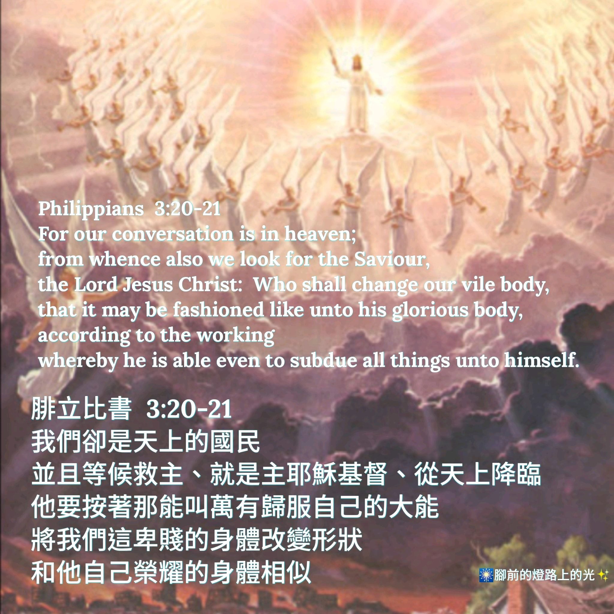 “我们却是天上的国民。并且等候救主,就是主耶稣基督,从天上降临。祂要按着那能叫万有归服自己的大能,将我们这卑贱的身体改变形状,和祂自己荣耀的身体相似。”(腓3:20–21)阿们!
