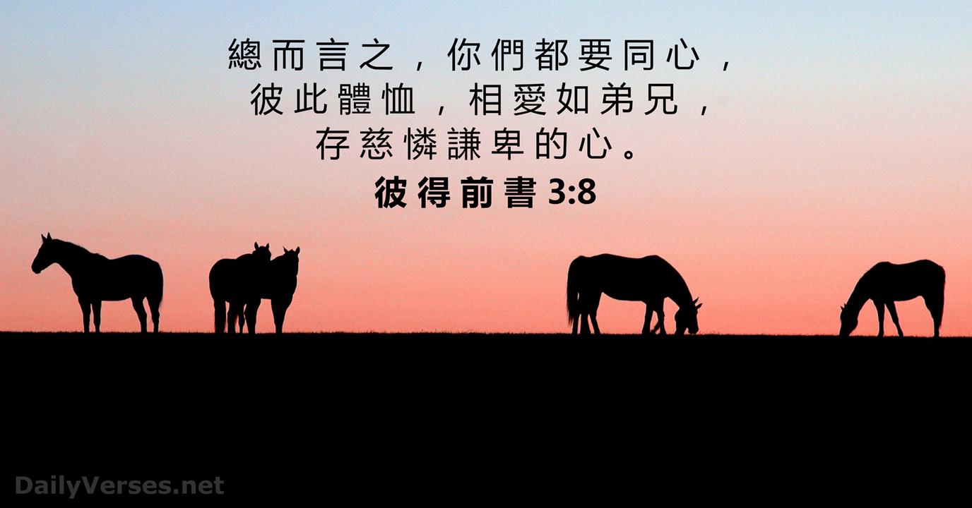 8总而言之,你们都要同心,彼此体恤,相爱如弟兄,存慈怜谦卑的心;9 不以恶报恶、以辱骂还辱骂,倒要祝福;因你们是为此蒙召,好叫你们承受福气。
