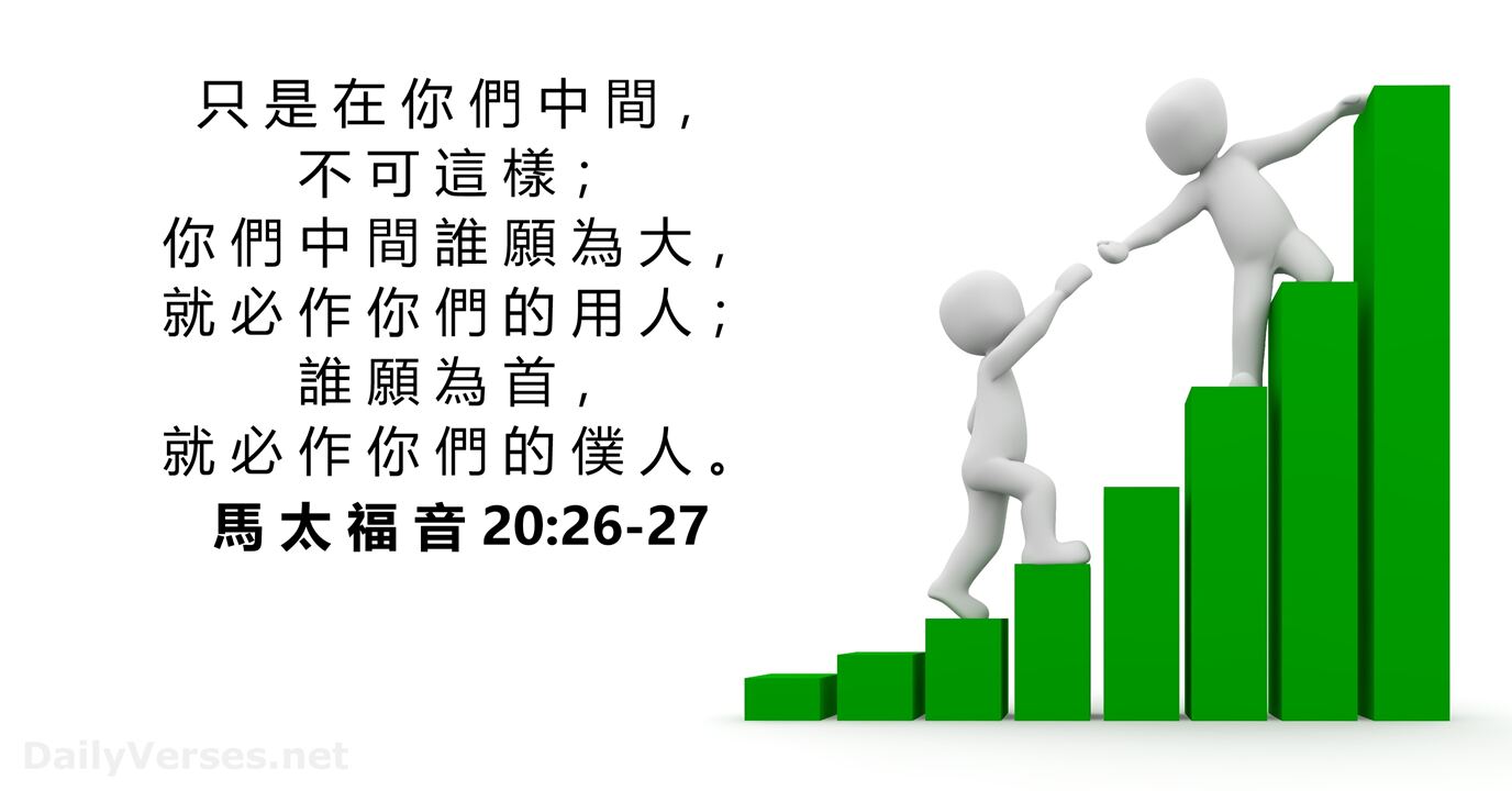 42耶稣叫他们来,对他们说:“你们知道,外邦人有尊为君王的治理他们,有大臣操权管束他们。43 只是在你们中间,不是这样。你们中间,谁愿为大,就必作你们的用人;44 在你们中间,谁愿为首,就必作众人的仆人。45 因为人子来,并不是要受人的服事,乃是要服事人,并且要捨命作多人的赎价。”