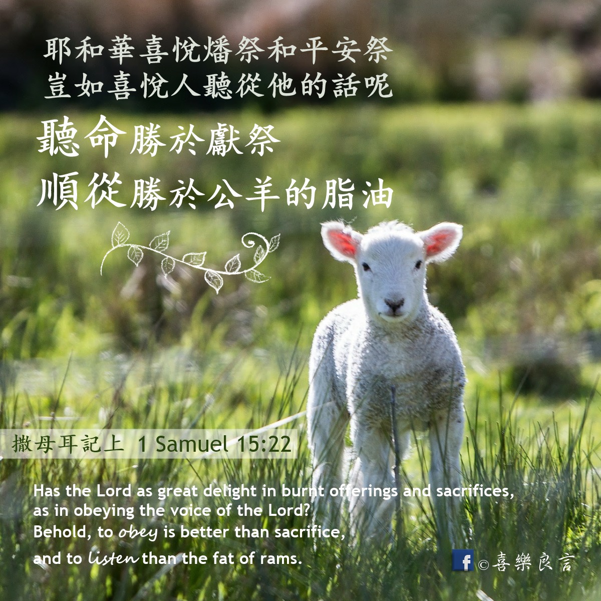 今日经文:“听命胜于献祭,顺从胜于公羊的脂油。悖逆的罪与行邪术的罪相等,顽梗的罪与拜虚神和偶像的罪相同。”(撒上15:22b-23a)