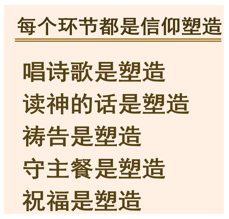 读神的话是在塑造,朗诵主导文,读使徒信经,宣讲神的话也是塑造,建立神儿女以神的话来引导和修正人生的道路,明白神从始至终在人类,在万有,在祂儿女身上奇妙可畏的作为;