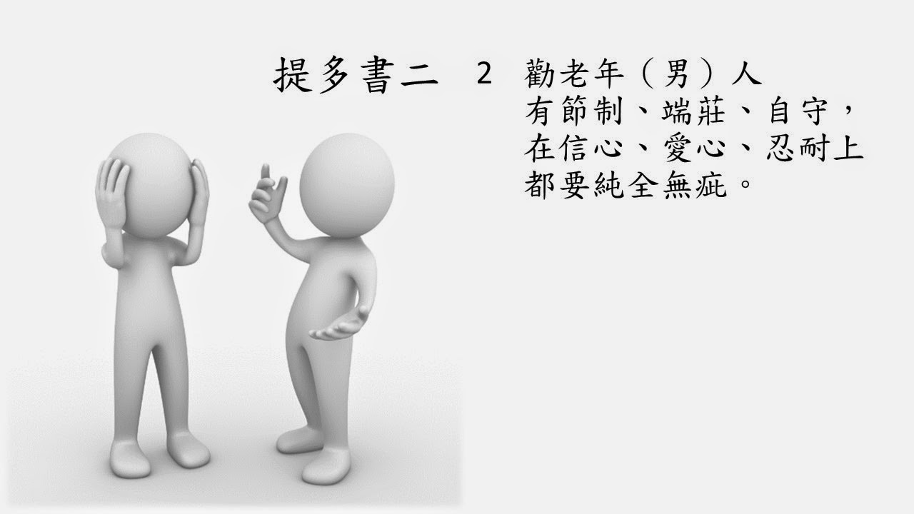 这里也是从老年人开始,中文翻译劝老年人要,原文是老年男人应该要,表示说这些事情他们本来就知道,但没有好好做到,提多必须提醒他们应该要做到。一共有六个项目,都是关于人的言行品格操守:节制、端庄、自守,信心、爱心、忍耐。