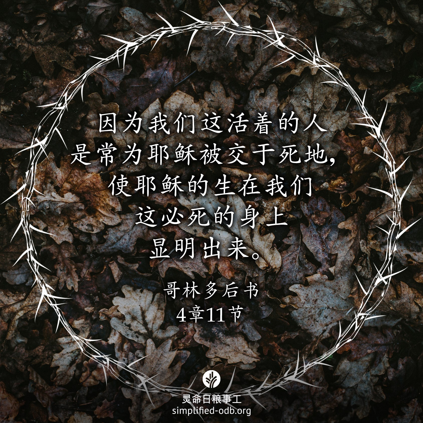 10身上常带着耶稣的死,使耶稣的生也显明在我们身上。11因为我们这活着的人是常为耶稣被交于死地,使耶稣的生在我们这必死的身上显明出来。12这样看来,死是在我们身上发动,生却在你们身上发动。