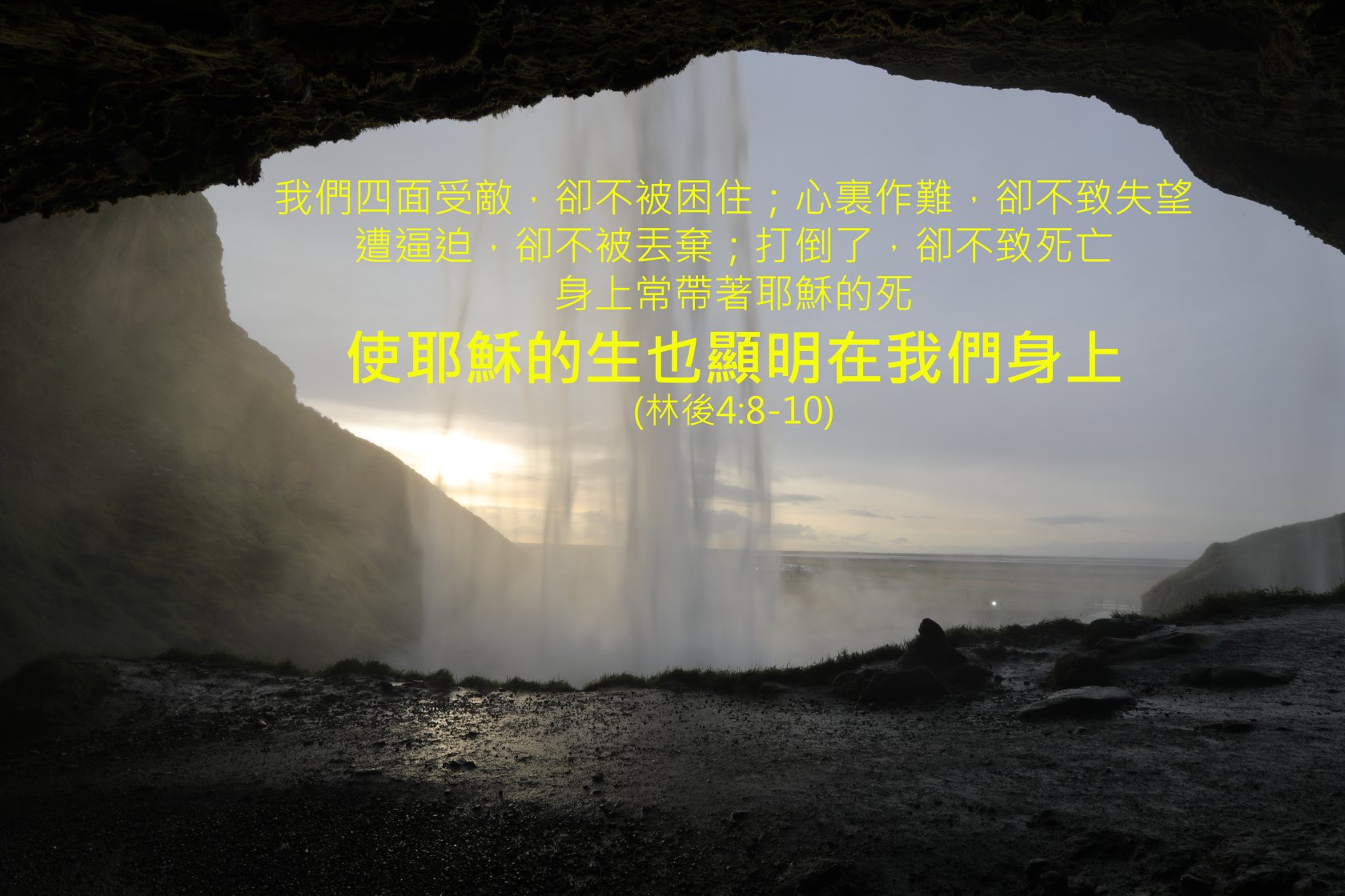 “常被交于(死地)”(παραδιδόμεθα)是现在式被动态动词,说明为信仰的缘故被交于死地是基督徒的生命常态。正是因为这种常常被交于死地的状态,以至于“使耶稣的生在我们这必死的身上显明出来”。
