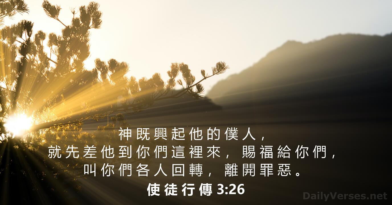 “从撒母耳以来的众先知,凡说预言的,也都说到这些日子。你们是先知的子孙,也承受神与你们祖宗所立的约,就是对亚伯拉罕说,地上万族,都要因你的后裔得福。神既兴起祂的仆人,就先差祂到你们这里来,赐福给你们,叫你们各人回转,离开罪恶。”(徒3:24–26)