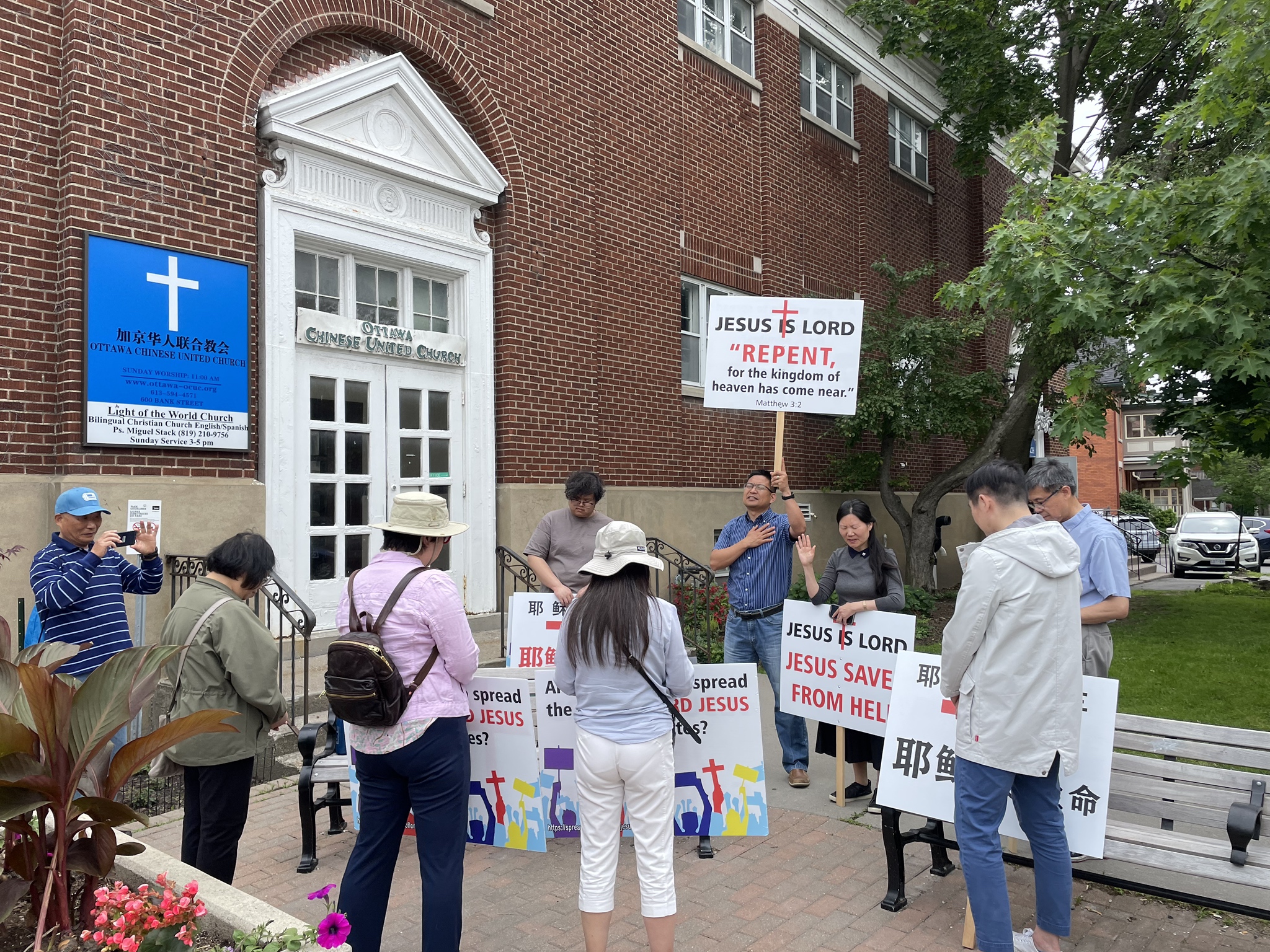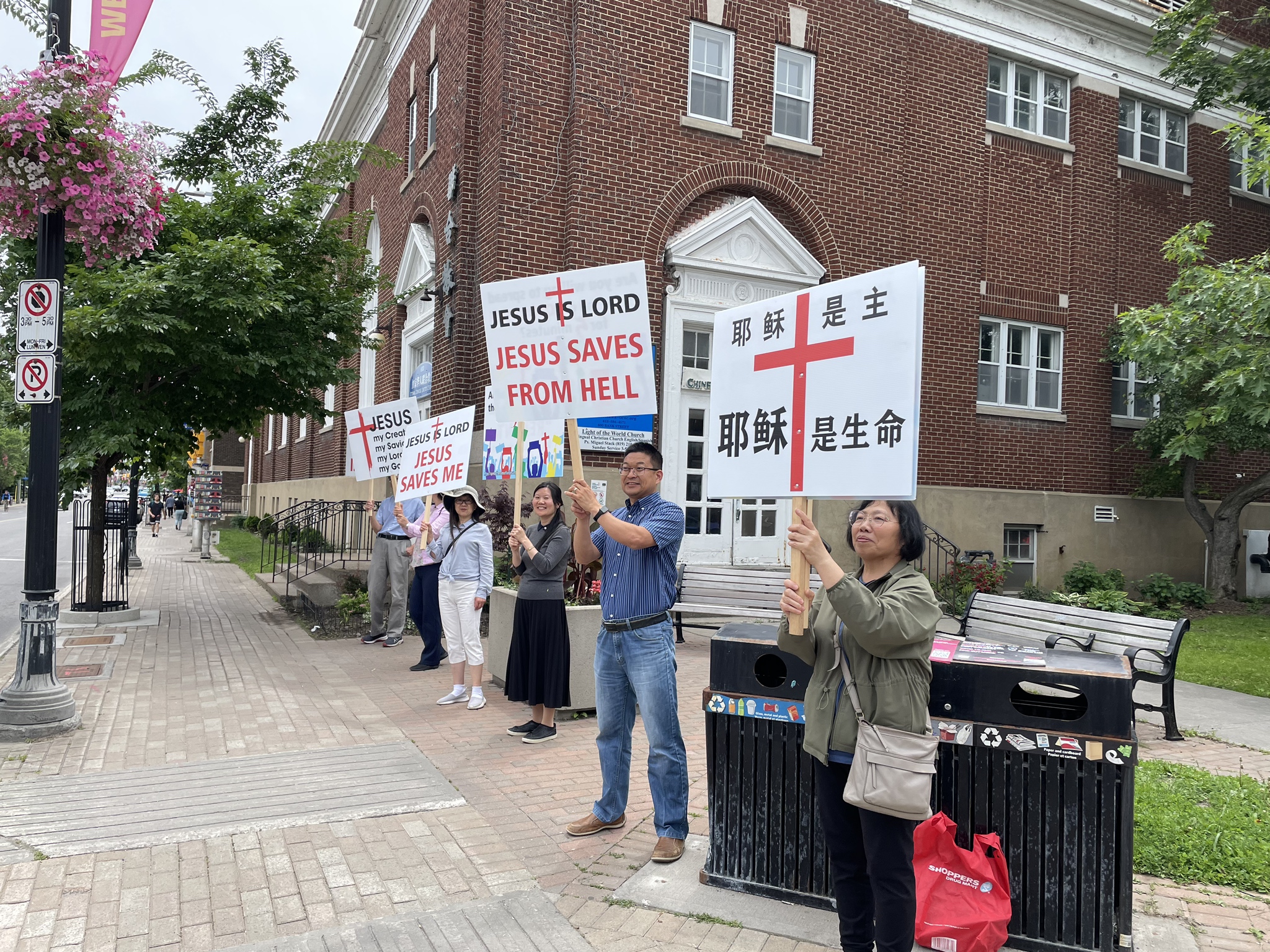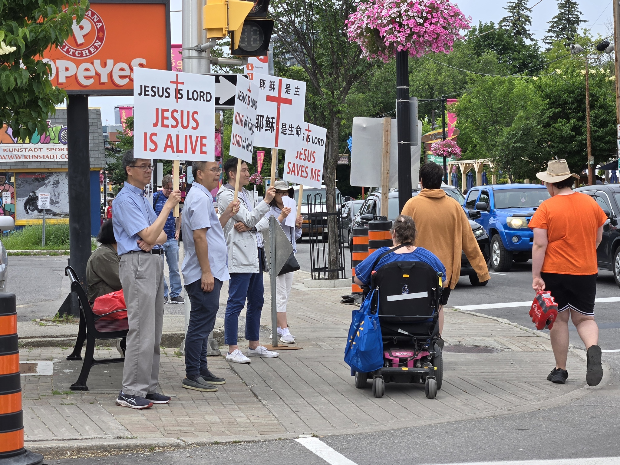 我们在教会门口把12张写着“耶稣降世为拯救世人”、“悔改吧,神的国近了”等中英双语的牌子高高举起,也第一次观察到,当主的名被高举的时候,当地人的反应——有竖大拇指点赞的、有鸣笛致意的;也有竖中指的、摇头的、不屑的、躲避的。我们从教会向周边一个十字路口一个十字路口地扩展,我心中一直不停祷告,也时时鼓励举牌的弟兄姐妹们为眼前走过的灵魂祷告,愿主施恩、怜悯渥太华这个城市。多少的灵魂在迷失、游荡,如果主来了,将是多么可怕的光景啊。彼得后书3章9节说:“主所应许的尚未成就,有人以为祂是耽延,其实不是耽延,乃是宽容你们,不愿有一人沉沦,乃愿人人都悔改。”当心中被主的爱充满时,对灵魂的负担就来了,很多参与的弟兄姐妹也说,他们感受到了福音的大能以及上帝的爱与怜悯,自己举起牌子的那一刻,对主的认识就从头脑进入了内心,借着举牌,我们的心不仅被福音重振、被圣灵坚固,更因这样一起的服事主,联结地更紧密了。举牌中,弟兄姐妹们一起唱诗、彼此鼓励,互相祷告、答“阿们”,我也看到,上帝仍然在我们这个小教会工作,仍然在使用祂的儿女;我的心也时时被弟兄姐妹激励,被主的爱感动着。