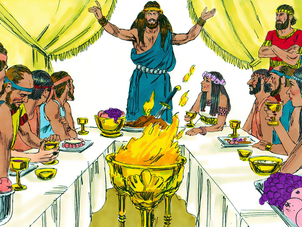 参孙为了迎娶新娘,在女方家里摆设筵席。在筵宴设摆的现场,众人“看见”参孙,就请了30个人陪伴他。有可能是因为非利士人害怕参孙,所以找来了30个人看住他。7天的婚宴在古代的各民族中也是常见的,参孙出谜语表面看是为了助兴,实则是为了完成攻击非利士人的计划。参孙就对陪客说:我给你们出一个谜语 (也是圣经中唯一的谜语),你们在7日宴席之内,若能猜出意思告诉我,我就给你们30件里衣,30套衣裳;你们若不能猜出意思告诉我,你们就给我30件里衣,30套衣裳。他们说:“请将谜语说给我们听。”参孙就对他们说:“吃的从吃者出来;甜的从强者出来。”(士14:14)