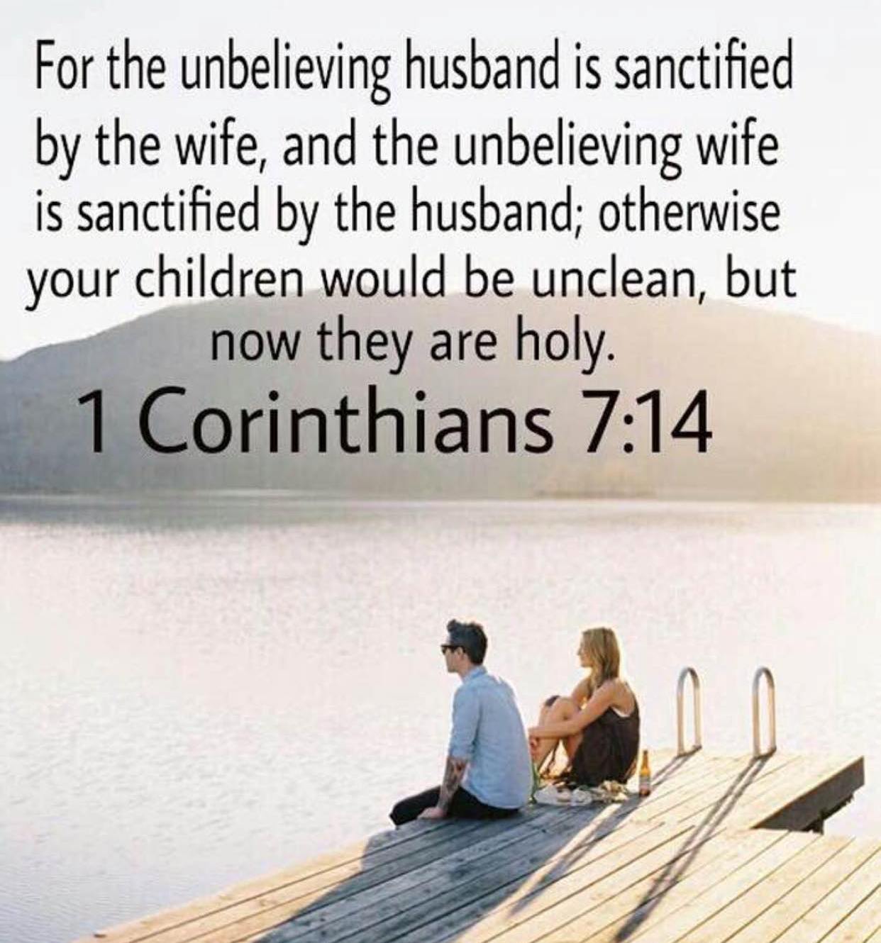 14因为不信的丈夫就因着妻子成了圣洁,并且不信的妻子就因着丈夫成了圣洁。不然,你们的儿女就不洁净,但如今他们是圣洁的了。15 倘若那不信的人要离去,就由他离去吧!无论是弟兄,是姐妹,遇着这样的事都不必拘束。神召我们原是要我们和睦。