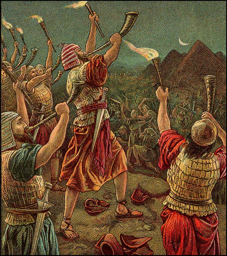 基甸召集军队,下达作战指令。他的策略是,带领三百人深夜潜入敌营,在军营的四围一手举起火把,一手拿着角吹,并发出呐喊:耶和华和基甸的刀!兵力虽少,却制造一种大军来临、声势浩大的压迫感,迫使米甸军人在混乱中自相残杀。此外,基甸还派以法莲人堵住关口,斩断敌人逃跑的退路。基甸的信心行动,首战告捷(士7:16–25)。