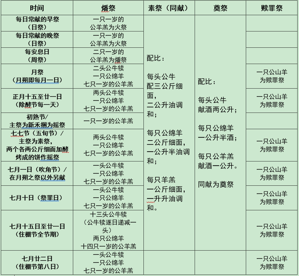 从中可见,神要选民每日有早、晚祭,每周有安息日祭,每月的一日有月朔祭,以及每年的六大节期祭。