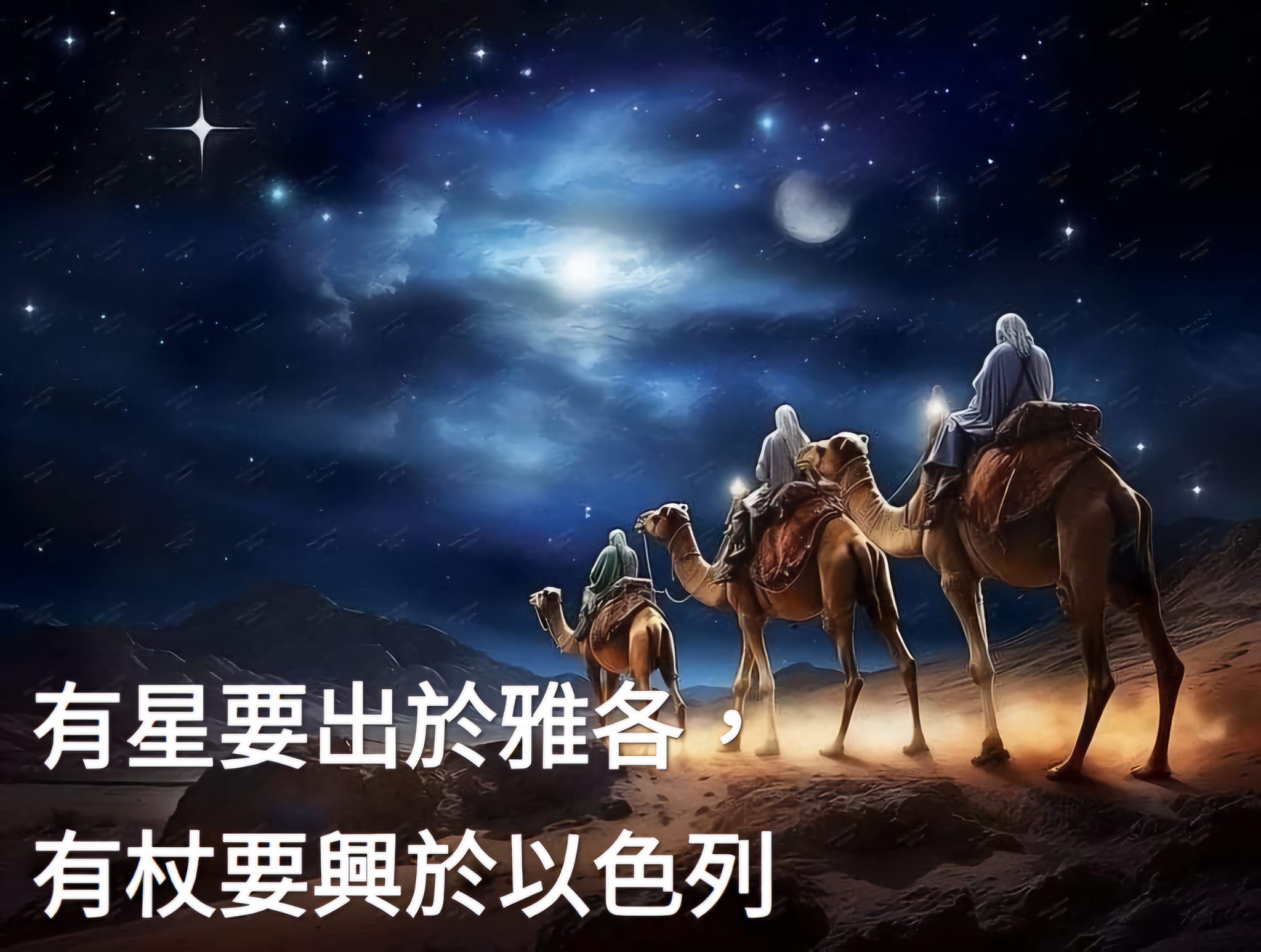 我看他却不在现时,我望他却不在近日。有星要出于雅各,有杖要兴于以色列,必打破摩押的四角,毁坏扰乱之子。他必得以东为基业,又得仇敌之地西珥为产业。以色列必行事勇敢。有一位出于雅各的,必掌大权。他要除灭城中的余民。(民数记24:17–19)