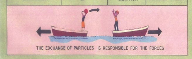 比如,电子之间是通过交换光子,就是光发生作用,所以光就是电磁波。质子中子,所谓的核子,在原子核里面,是通过交换所谓的介子发生相互作用。这幅图很好地说明了双方如何通过交换一个东西而发生互动。两个小船上的人当彼此抛出并接住对方抛来的皮球的时候,由于作用力和反作用力的缘故,两个小船就会彼此分开远离。所以两个小船上的人通过交换手中的球而发生了互动。