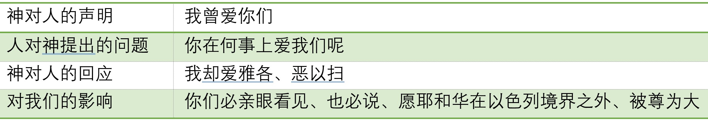 因此,神一开始就坚定了祂的应许是信实的。而第一个信息也肯定神对他们的爱是(1)表现在祂的圣约中;(2)表现在祂的保护中;(3)也表现在祂的恩典中。