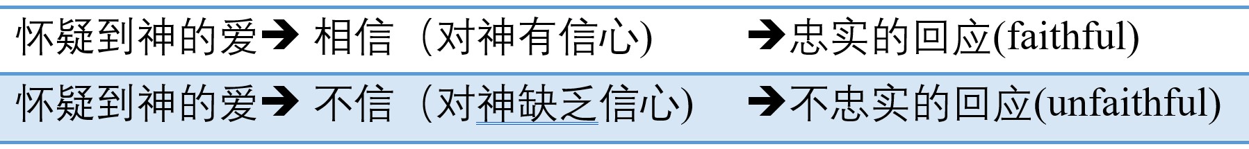 从这两件事,我们可以看出信心和怀疑之间存着某种关系。事实上,在日常生活中,当我们面临不确定性和艰难的环境时,我们对主会做出忠实回应,还是不忠实的回应呢?