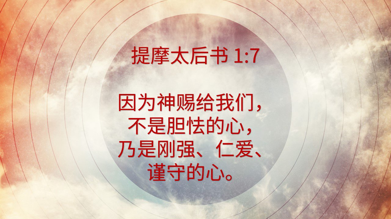 “想到你心里无伪之信,这信是先在你外祖母罗以和你母亲友妮基心里的,我深信也在你的心里。为此我提醒你,使你将神藉我按手所给你的恩赐再如火挑旺起来。因为神赐给我们,不是胆怯的心,乃是刚强、仁爱、谨守的心。你不要以给我们的主作见证为耻,也不要以我这为主被囚的为耻;总要按神的能力,与我为福音同受苦难。”(提摩太后书1:5–8)