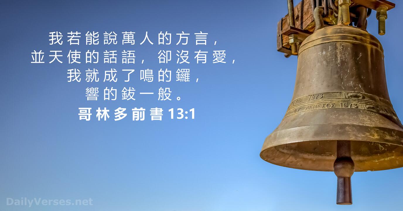 1我若能说万人的方言,并天使的话语,却没有爱,我就成了鸣的锣、响的钹一般。2我若有先知讲道之能,也明白各样的奥秘、各样的知识,而且有全备的信,叫我能够移山,却没有爱,我就算不得什么。3我若将所有的赒济穷人,又舍己身叫人焚烧,却没有爱,仍然与我无益。