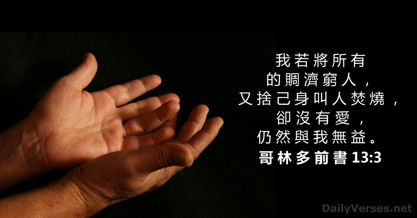 第3节更进一步,好像到了极限地说,我如果能够将所拥有的财富都拿去帮助穷人做慈善,甚至把自己的生命都献上。原文没有焚烧这个字。我把生命都献上给人,真是到了极限了,但我若没有爱,不是出于对神的爱,对人的爱,仍然与我无益(gain nothing),我仍然得不到什么,在神眼中仍然是无价值的。如果没有爱,即使把自己生命献上,也是为了自己,为了宣扬高举自己,成就自己的理想和荣耀。