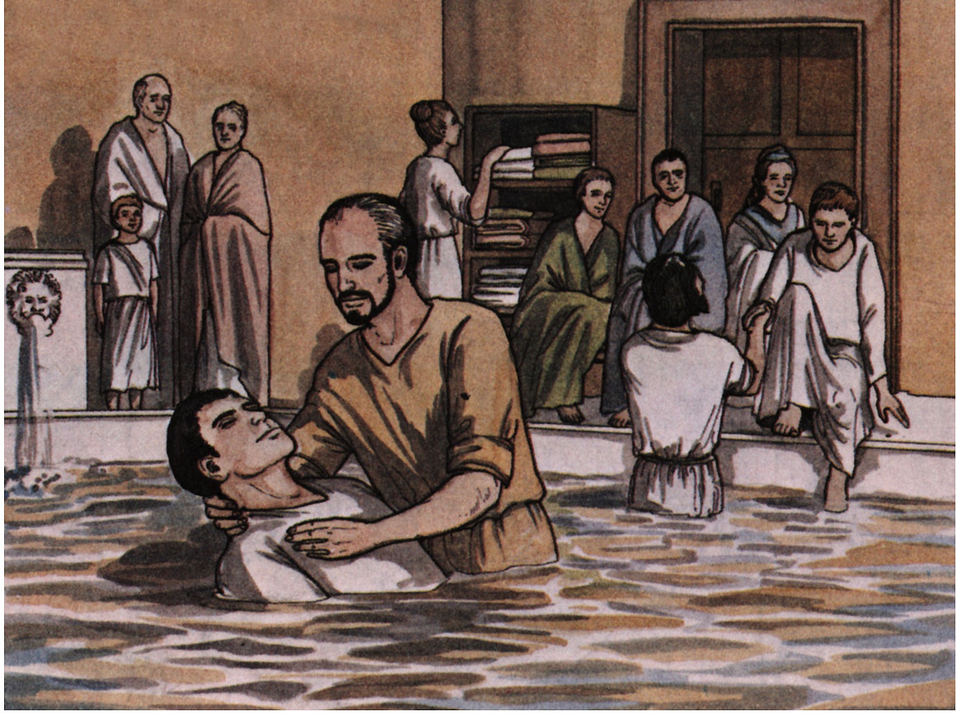 “当夜就在那时候,禁卒把他们带去,洗他们的伤。他和属乎他的人,立时都受了洗。于是禁卒领他们上自己家里去,给他们摆上饭,他和全家,因为信了神都很喜乐。”(徒16:33–34)