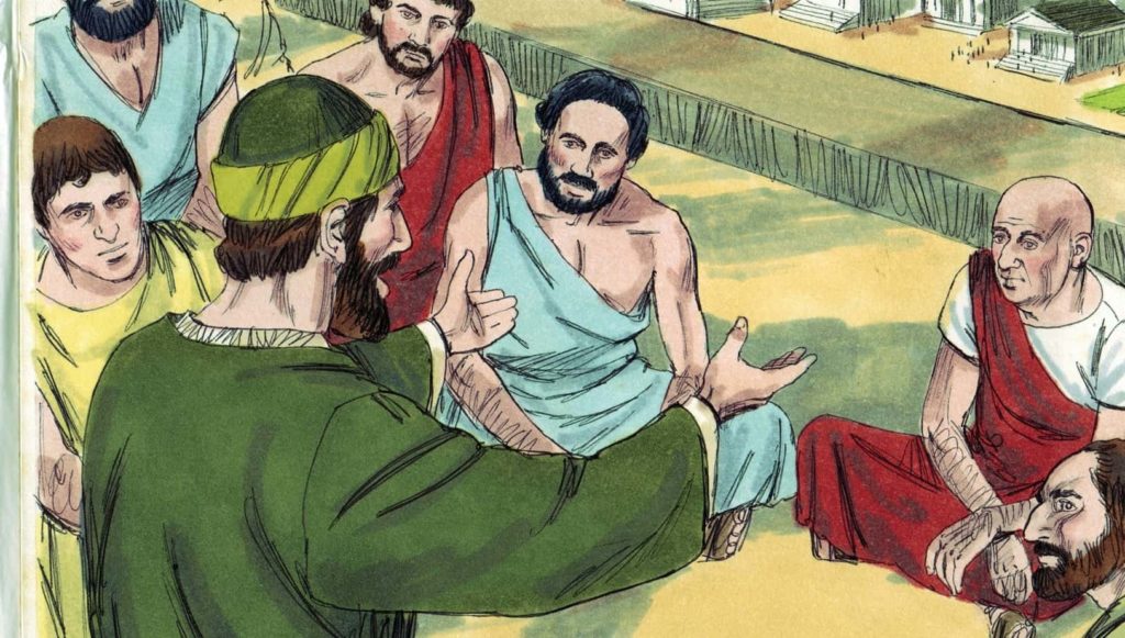 于是,安息日保罗在犹太会堂与犹太人和虔诚的希腊人辩论,安息日之外他每天在市上与所遇见的人辩论。保罗所做的一切,都围绕一个中心:无论得时不得时务要传道,随时随地传福音,千方百计总要救些人。