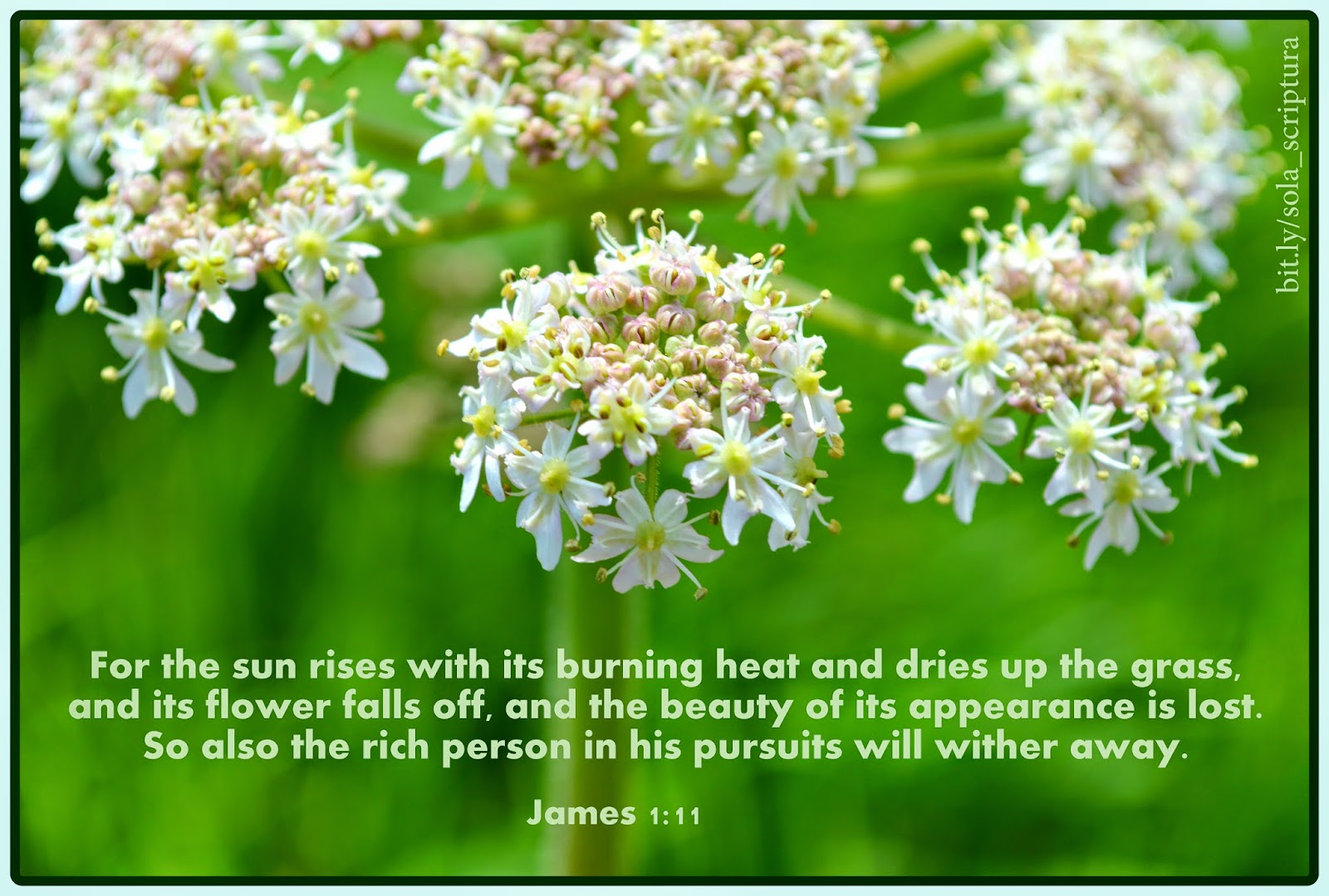 今日经文:“太阳出来,热风刮起,草就枯干,花也凋谢,美容就消没了;那富足的人在他所行的事上也要这样衰残。”(雅1:11)