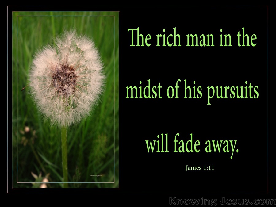 衰残μαραίνω (玛瑞奥) 这个字词新约仅出现1次。其原文语法表达出这件事情必要发生的真实性与迫切性;仿佛不幸就在眼前,下一刻就会发生。正如穆尔 (1985/1988,页 61) 所言:“在此显然有死亡的含意”。而参照本节上文,及雅4:13–14来看,很可能指富有的基督徒被神突然取去 (穆尔,页 61)。就如主耶稣的提醒:“无知的人哪,今夜必要你的灵魂,你所预备的要归谁呢?凡为自己积财,在神面前却不富足的,也是这样。”(路12:20–21) 此外,这节引用自以赛亚书40章6–7节的经文,对于中东的信徒而言,可谓再熟悉不过。早春的花朵在烈日下迅速枯萎凋谢,是他们每年都能观察到的景象 (穆尔,页 60)。