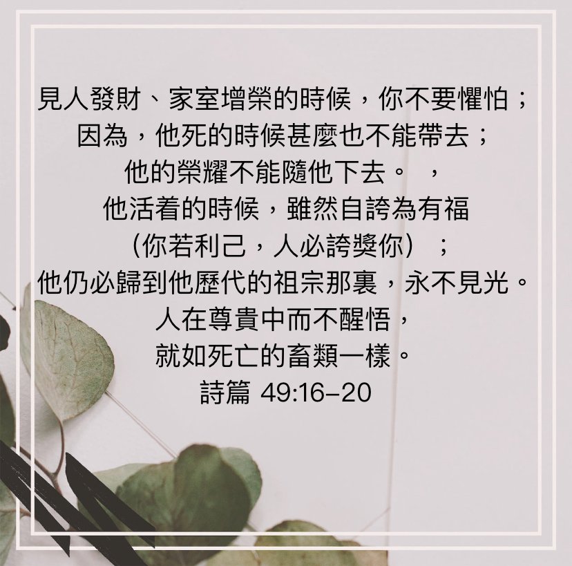 省思:地上的财富是我生命的“眼障”(参看太6:19–24),以致我无法全心献上、跟随基督吗?我还在为着“必要衰残”的财富而奋斗终生吗?请留意诗人的话,“因为他死的时候,什么也不能带去,他的荣耀不能随他下去……人在尊贵中而不醒悟,就如死亡的畜类一样。”(诗49:17、20)