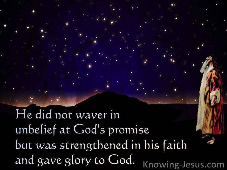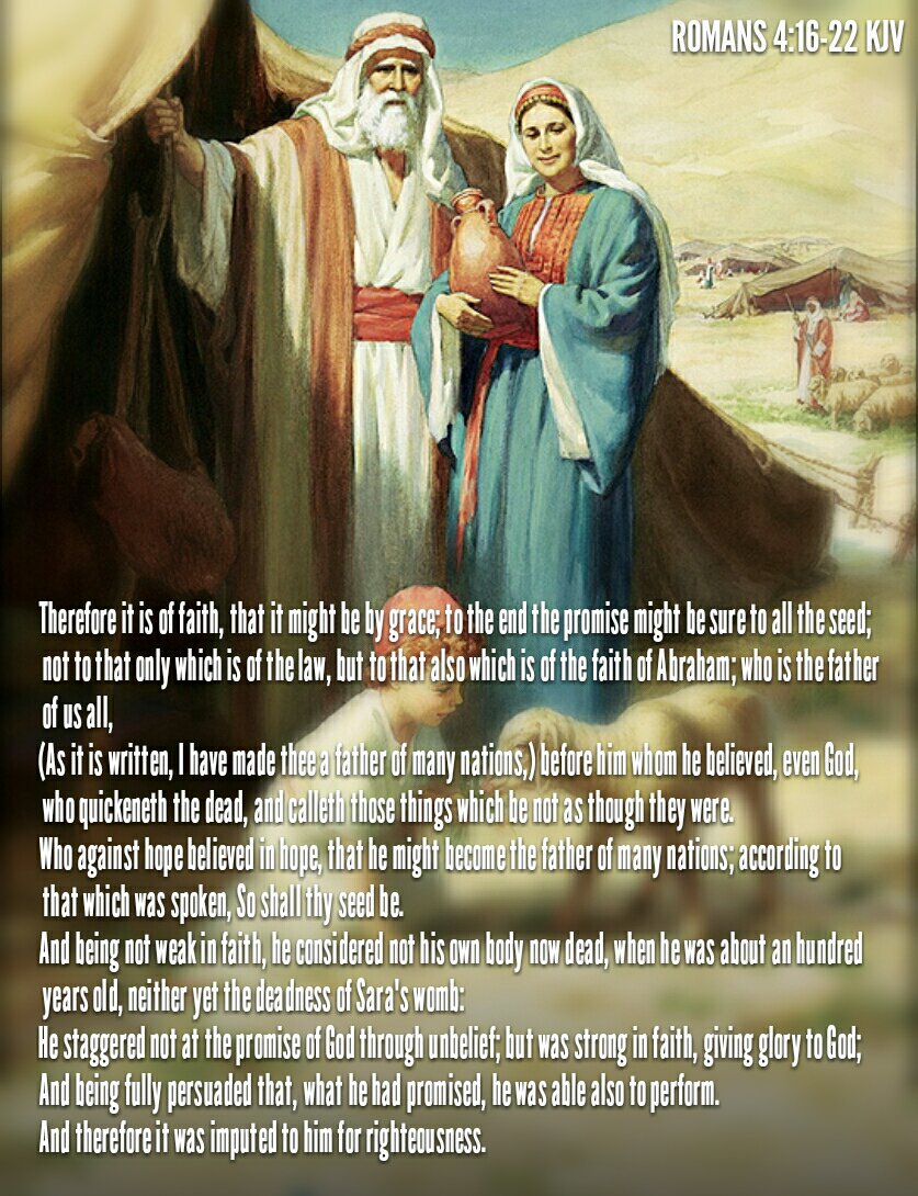 “亚伯拉罕所信的,是那叫死人复活、使无变为有的神,他在主面前作我们世人的父。如经上所记:‘我已经立你作多国的父。’他在无可指望的时候,因信仍有指望,就得以作多国的父,正如先前所说:‘你的后裔将要如此。’他将近百岁的时候,虽然想到自己的身体如同已死,撒拉的生育已经断绝,他的信心还是不软弱;并且仰望神的应许,总没有因不信,心里起疑惑,反倒因信,心里得坚固,将荣耀归给神。且满心相信神所应许的必能作成。所以这就算为他的义。‘算为他义’的这句话,不是单为他写的,也是为我们将来得算为义之人写的,就是我们这信神使我们的主耶稣从死里复活的人。耶稣被交给人,是为我们的过犯;复活,是为叫我们称义。”(罗 4:17–25)