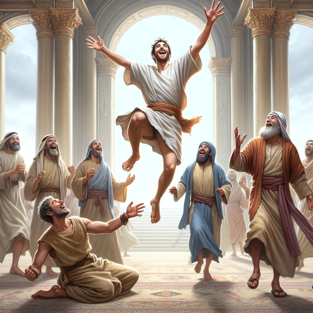 完全的赦免,新人代替旧人的情形,不禁令人想起那个在圣殿美门天天求周济、生来瘸腿的残疾人。如果用一幅画面来表达其蒙拯救后的喜悦之情,完全就是一副罪得赦免、重生得救后的鲜活效果图。人被罪辖制的时候,其悲惨受压的情形,相对于光明之子的自由释放,就是“残疾”的,一如那个生来瘸腿之人肉身所呈现出来的景况。当彼得说金银他都没有,只是奉拿撒勒人耶稣基督的名叫他起来行走时,发生在那瘸腿之人身上的一幕,大大超过了他所求所想的,所以他就用肢体语言表达出满心的喜悦——他成了一个新造的人: