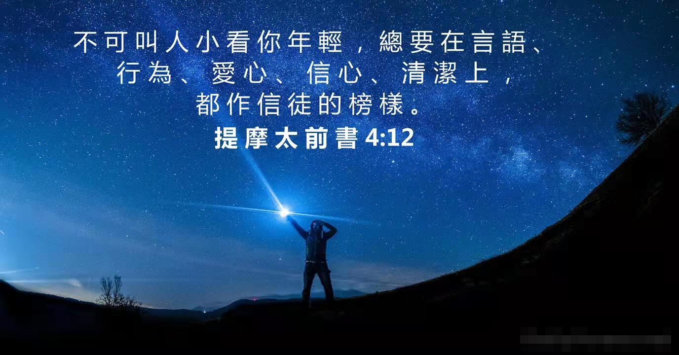 “不可叫人因为你年轻,总要在言语,行为,爱心,信心,清洁上,都作信徒的榜样。”(提摩太前书4:12)
