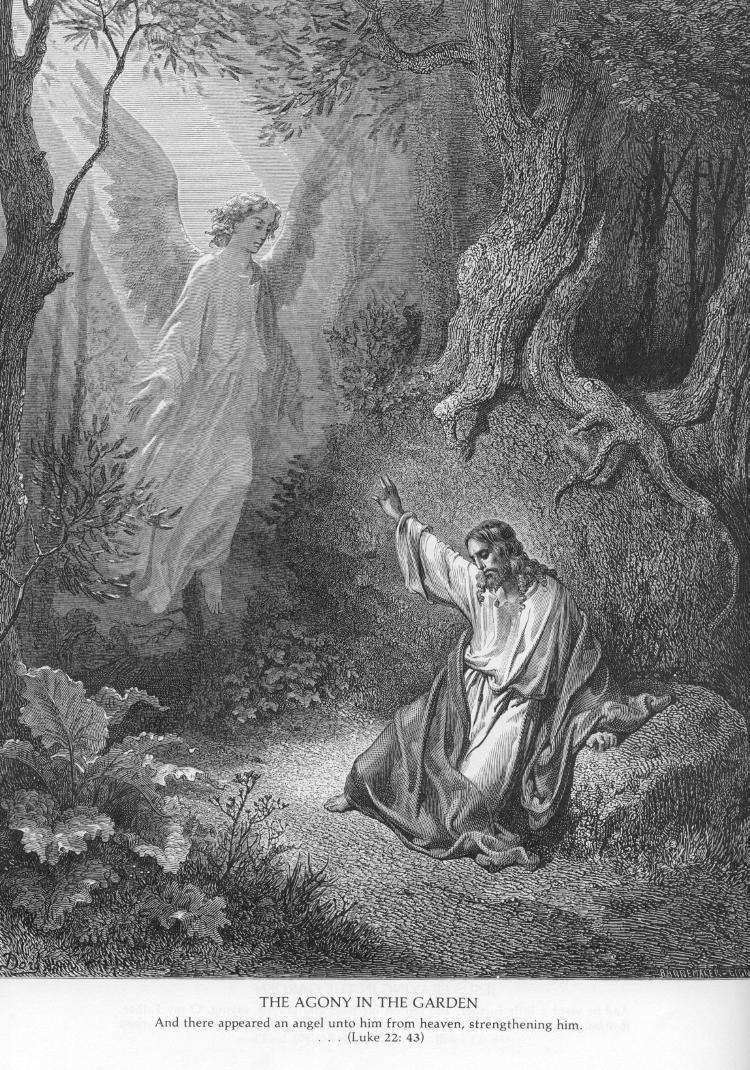 神没有带祂的儿子脱离患难的处境,而是派一个天使加添祂的力量。“有一位天使,从天上显现,加添祂的力量。耶稣极其伤痛,祷告更加恳切。汗珠如大血点,滴在地上。”(路22:33–44)