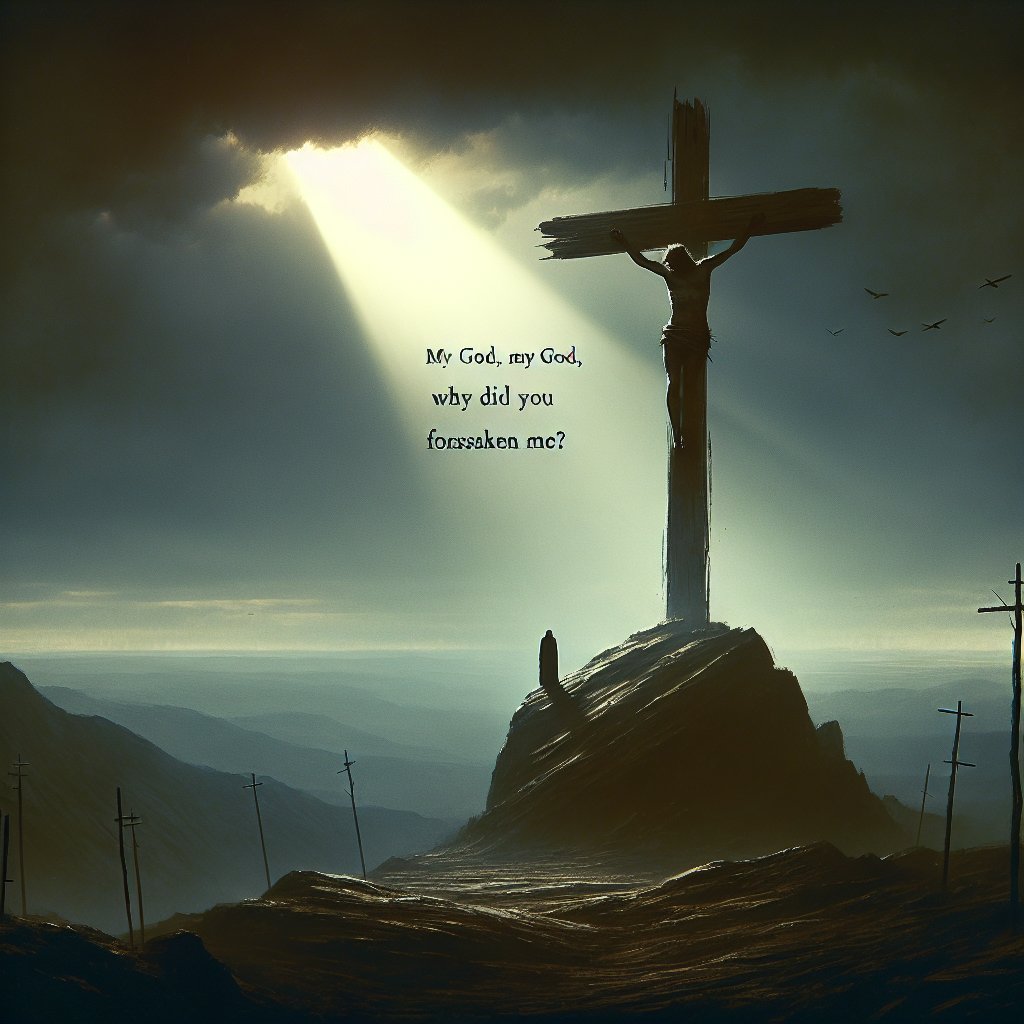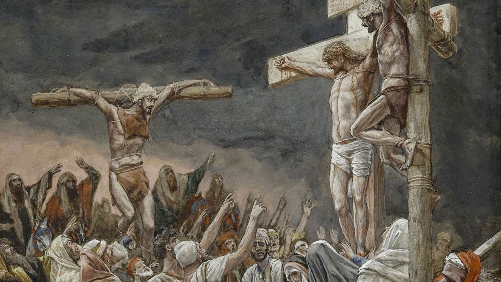 耶稣背着自己的十字架出来,但祂已经无力背起,兵丁只好强迫一个古利奈人西门背着祂的十字架,走向各各他。那里矗立着三个十字架,祂被赤身挂在木头上,承受着本不属于祂的咒诅和羞辱,因为连祂的褴褛的衣衫也被兵丁拈阄撕分。有两个强盗和祂同钉,一边一个,正如先知的预言:“祂被列在罪犯之中。”(赛53:12)