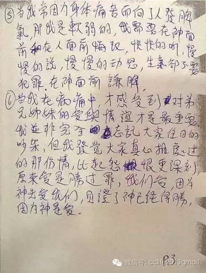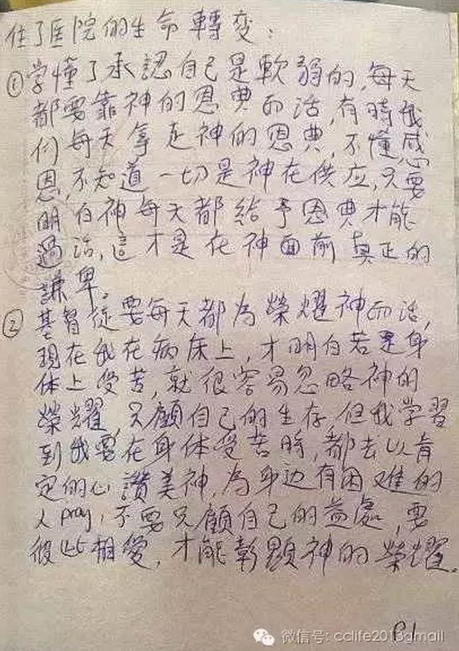 淑仪姐妹的癌症最近恶化,入院治疗。她对神没有半点埋怨,唯有关心怎样荣耀神。下面是她在病床上,最后几天写的一些话,可见她的生命被神改变了,和原来患“边缘人格障碍”的她,有天渊之别。以下是她在病床上写的手稿:住了医院的生命转变—