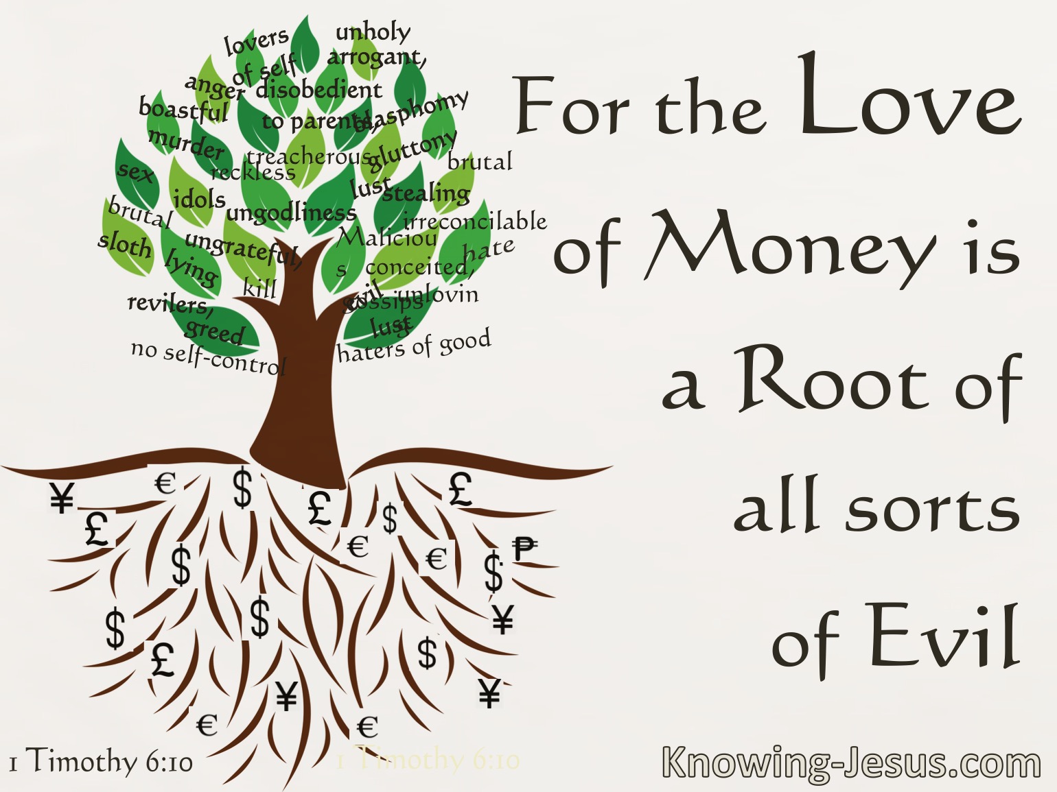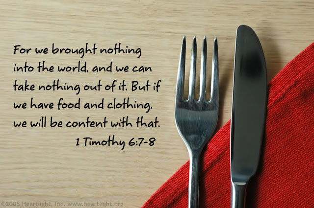 “然而敬虔加上知足的心便是大利了。因为我们没有带什么到世上来,也不能带什么去。只要有衣有食,就当知足。但那些想要发财的人,就陷在迷惑,落在网罗,和许多无知有害的私欲里,叫人沉在败坏和灭亡中。贪财是万恶之根。有人贪恋钱财,就被引诱离了真道,用许多愁苦把自己刺透了。”(提摩太前书6:6–10)